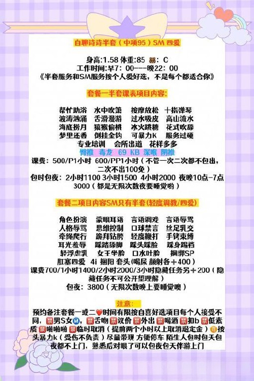 [服务项目]: 助浴 花式调情 花式吹箫 花式互动 毒龙 69 深喉 倒挂金钩 阴推 口爆 捆绑 调教 角色扮演等等
