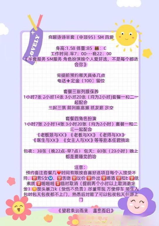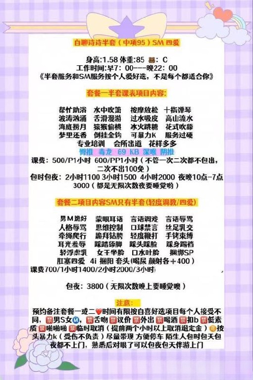 [服务项目]: 助浴 演绎 SM 抓龙筋 捆绑 踩踏 口舌 坐脸 口爆……