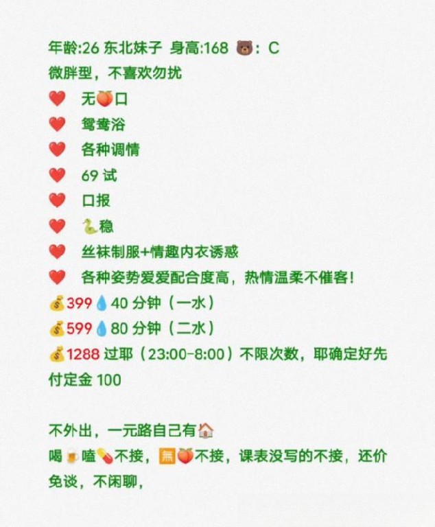 [服务项目]: 陪浴,漫游,口交,口爆,舌吻,胸推,69,丝袜,制服内衣诱惑