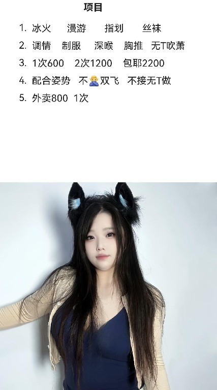 [服务项目]: 鸳鸯浴,调情,臀推,漫游,胸推,丝袜,制服,爱爱