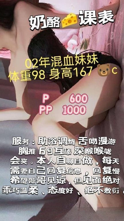 [服务项目]: 鸳鸯浴 按摩 指滑 胸推 调情 鼻息 舌吻 深喉 爱爱